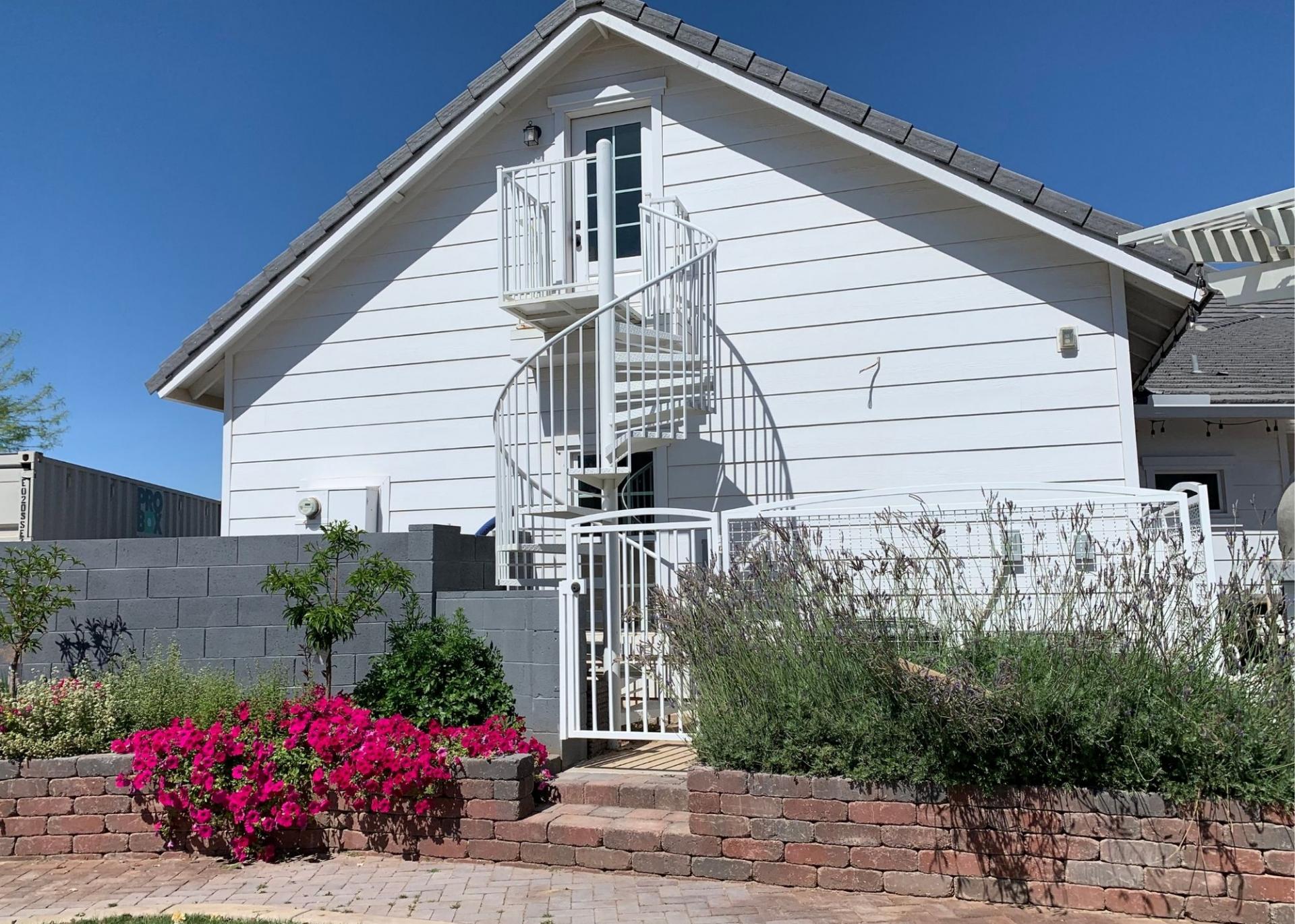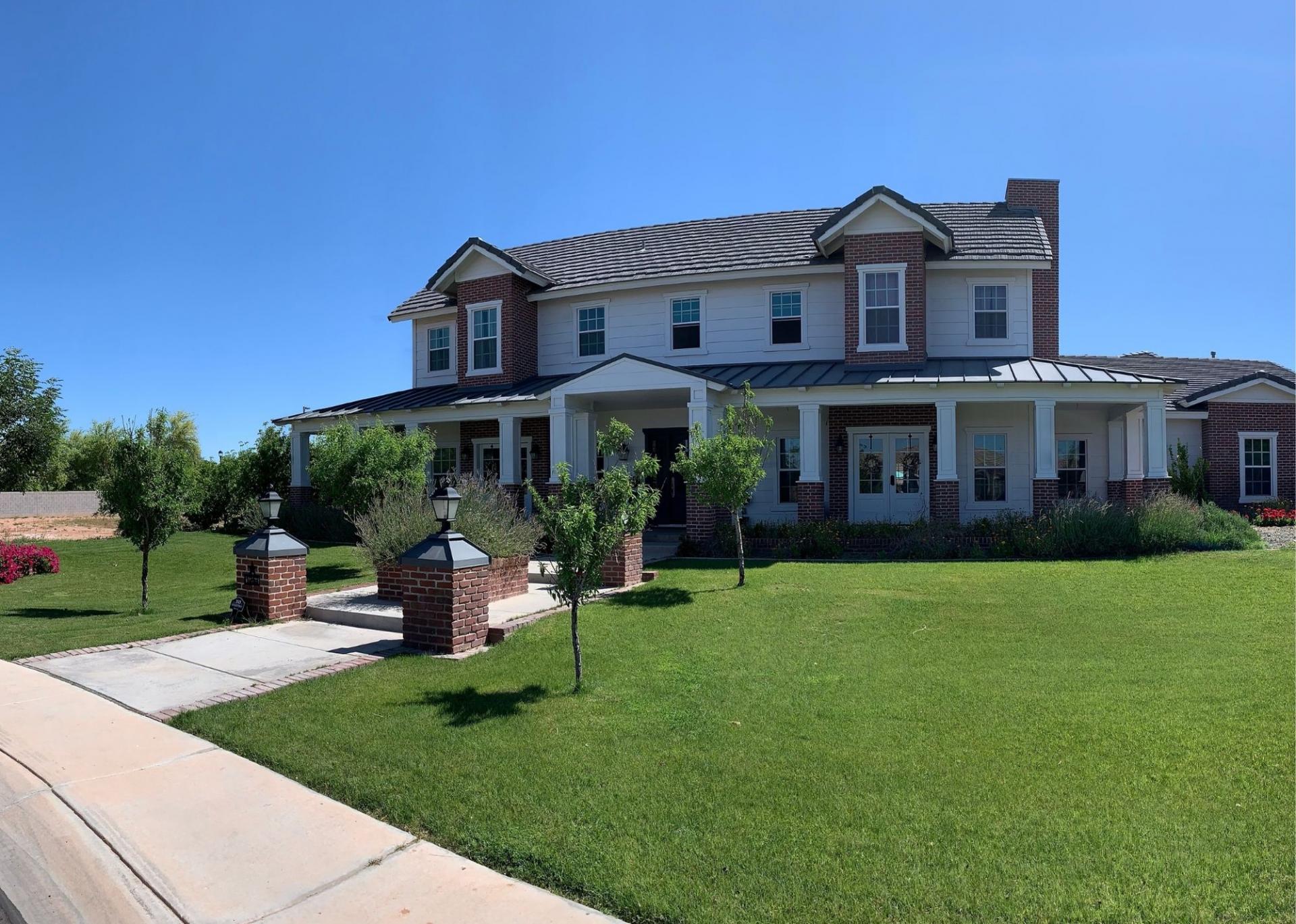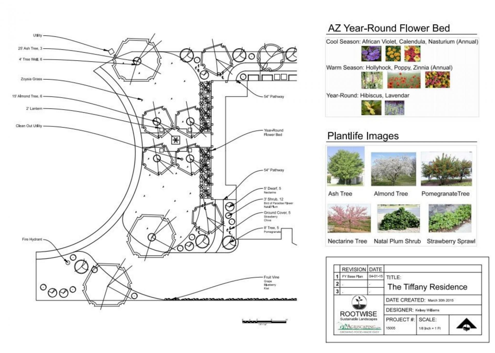Country fresh styling edible Agriscaped garden. In the front there are patches of watermelon, strawberries, and mint. A driveway lined with grape vines. Almond trees, peaches, plums and nectarines throughout the landscape.