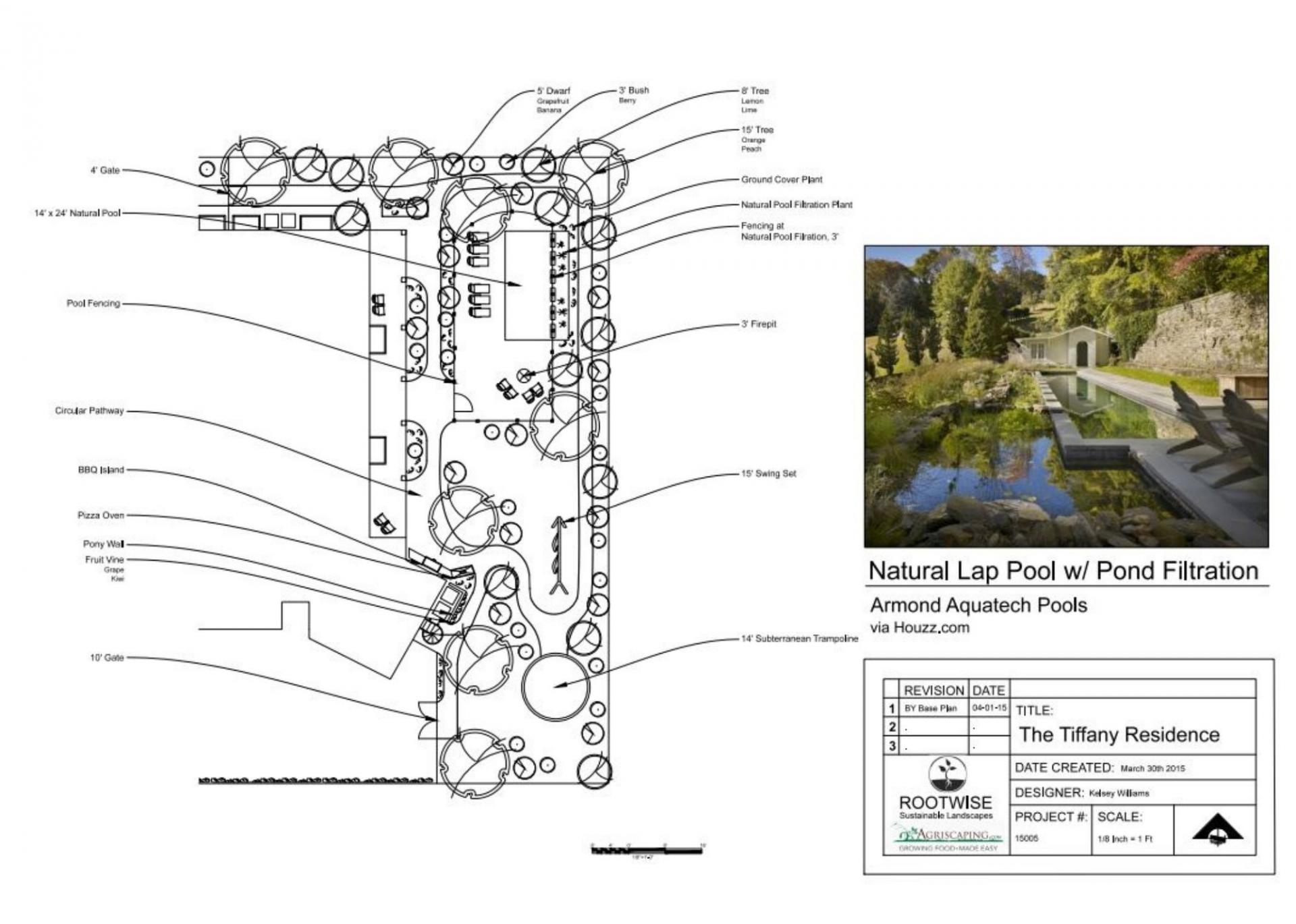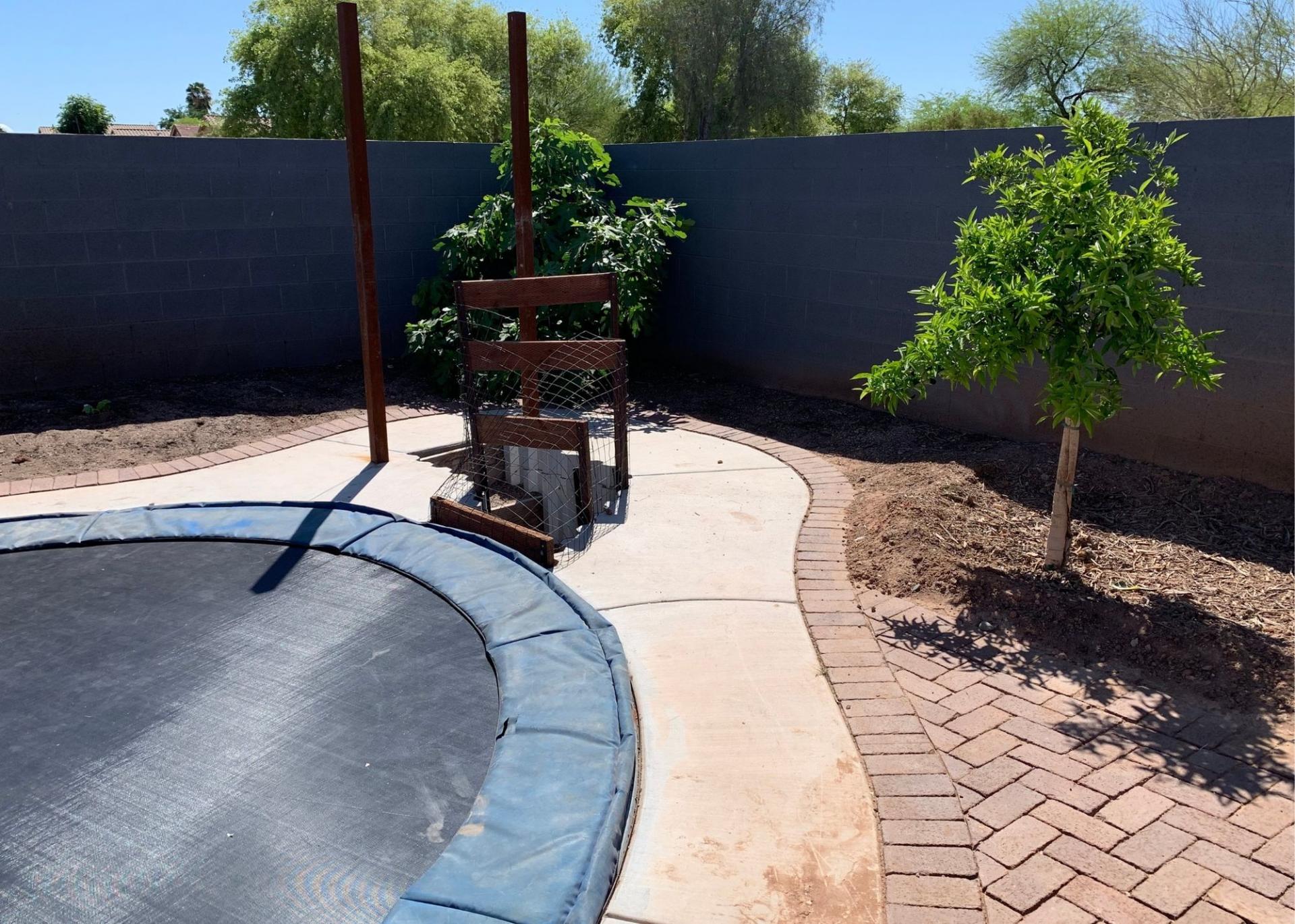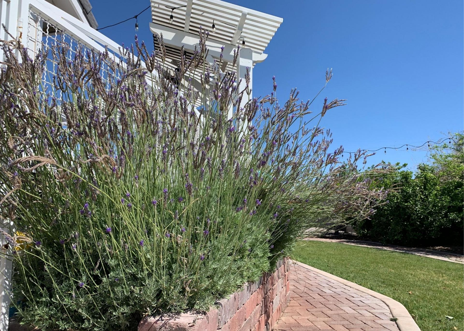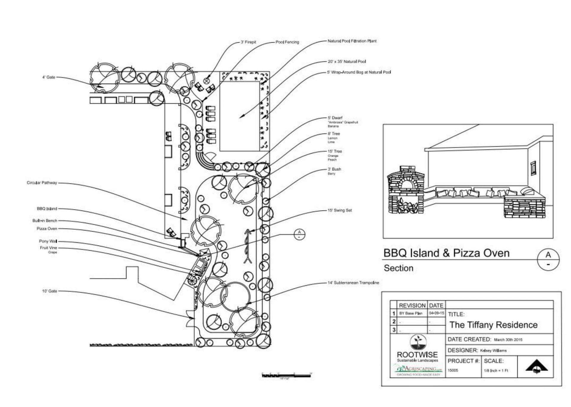 In the back there is an underground trampoline garden, lemongrass along the pool, lavender and more citrus trees, including kumquats and calmondon. A porch lined with garden beds with tomatoes, peppers, onions and many other herbs for a kitchen garden to use in their brick oven pizza.
