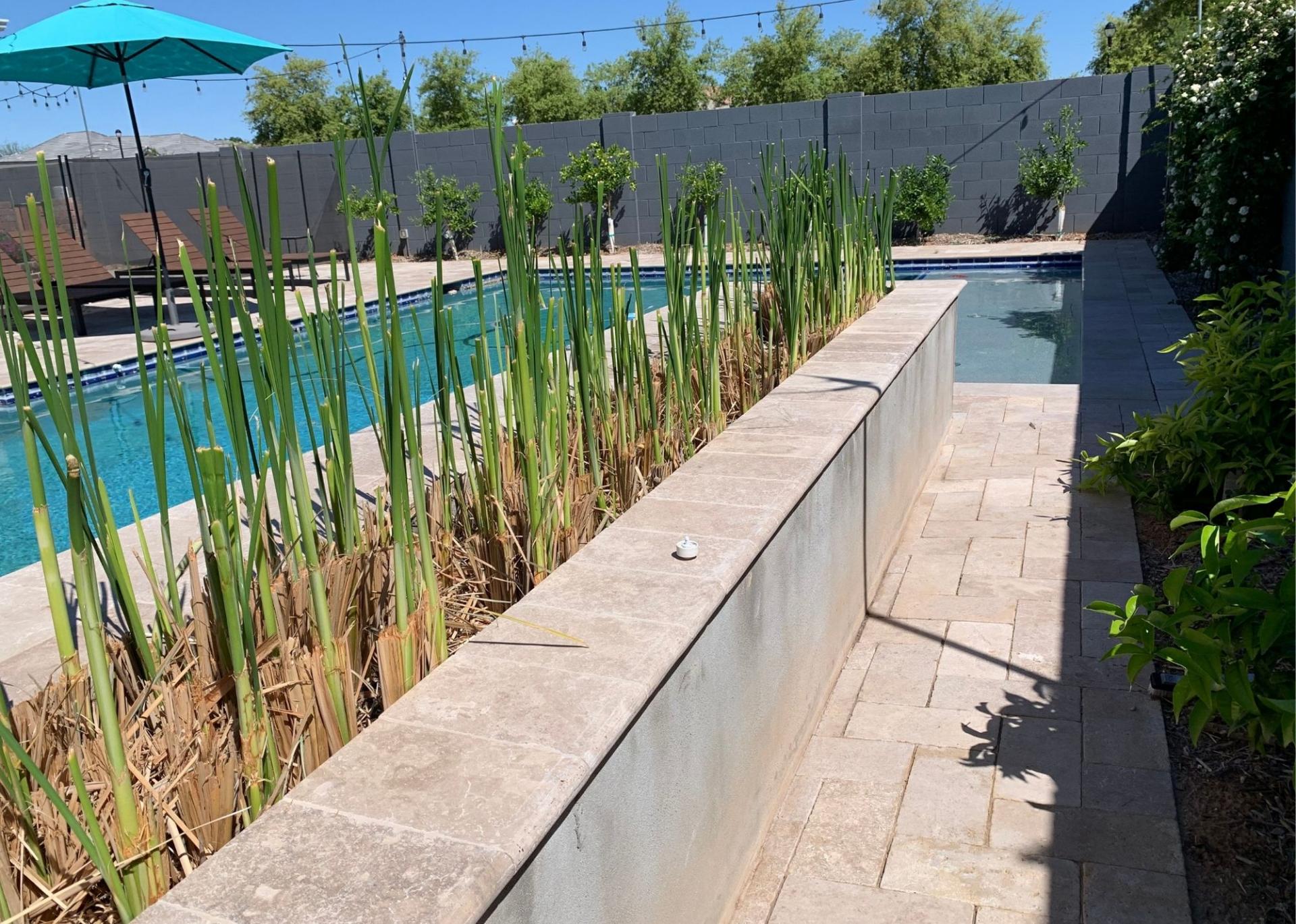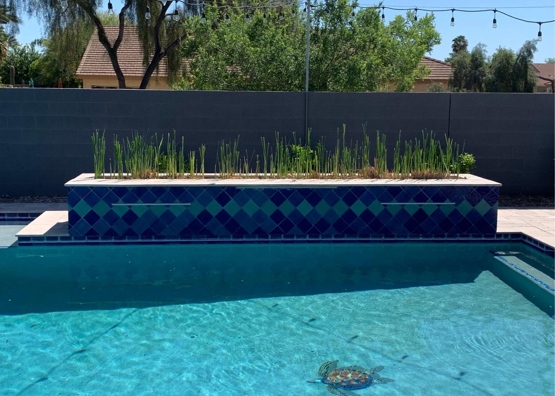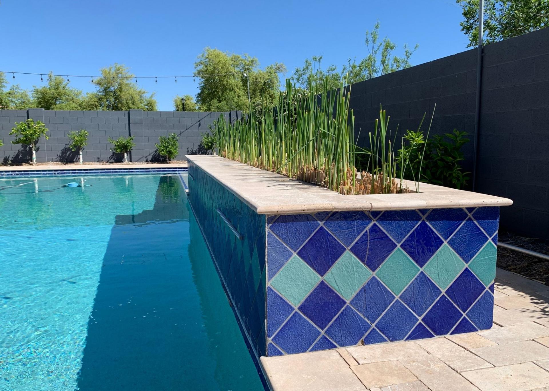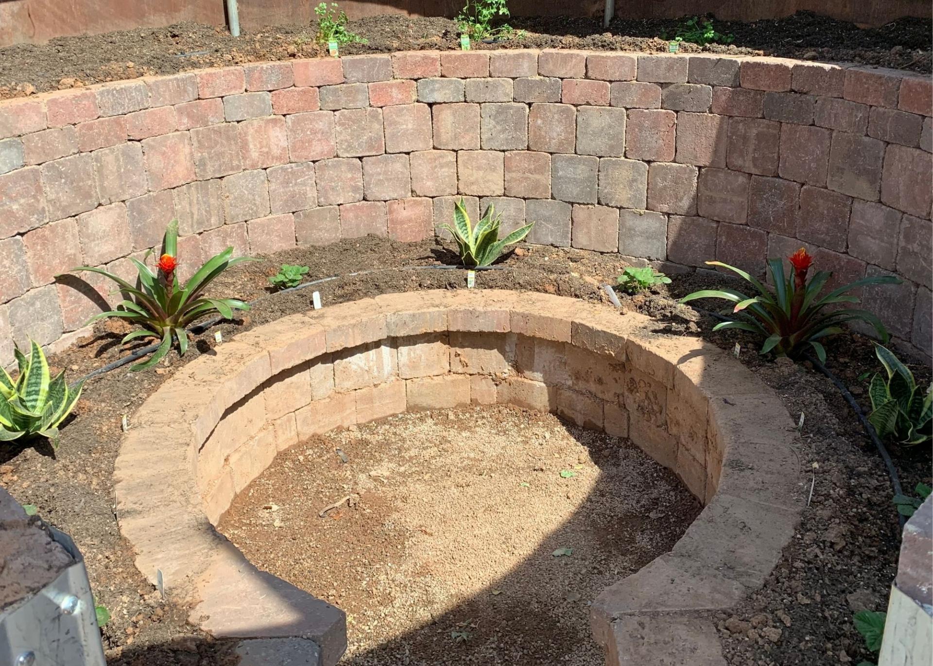 In the back there is an underground trampoline garden, lemongrass along the pool, lavender and more citrus trees, including kumquats and calmondon. A porch lined with garden beds with tomatoes, peppers, onions and many other herbs for a kitchen garden to use in their brick oven pizza.