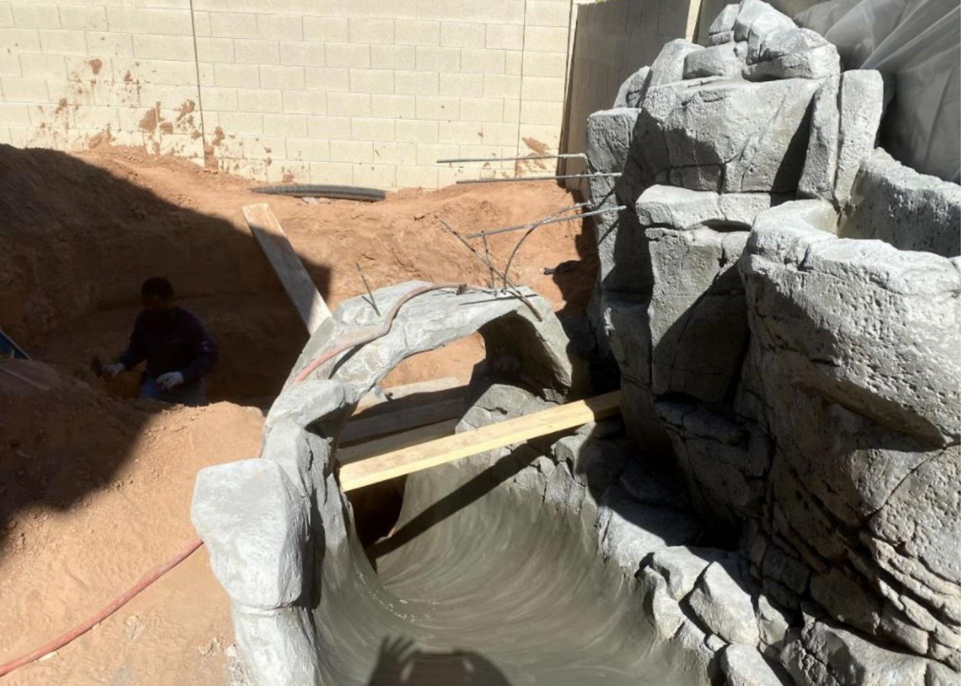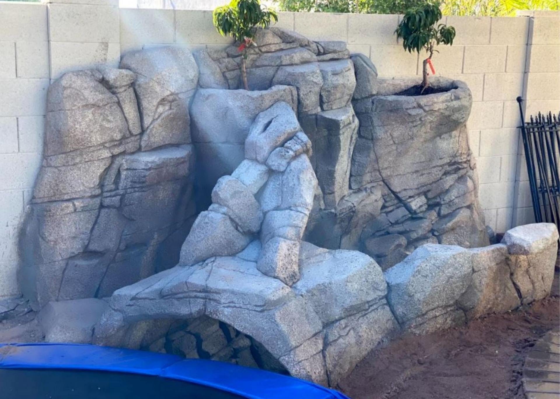 The construction of the rock slide entrance to the trampoline garden