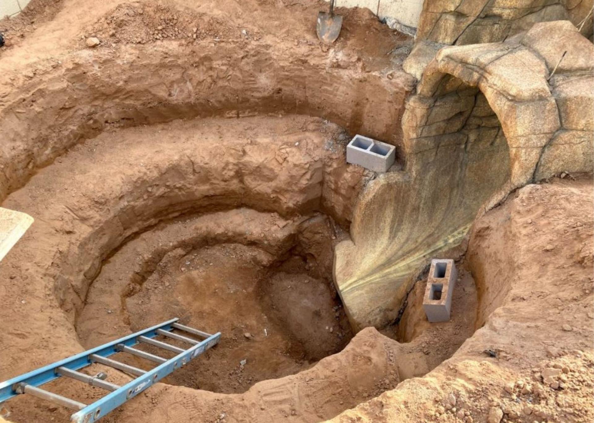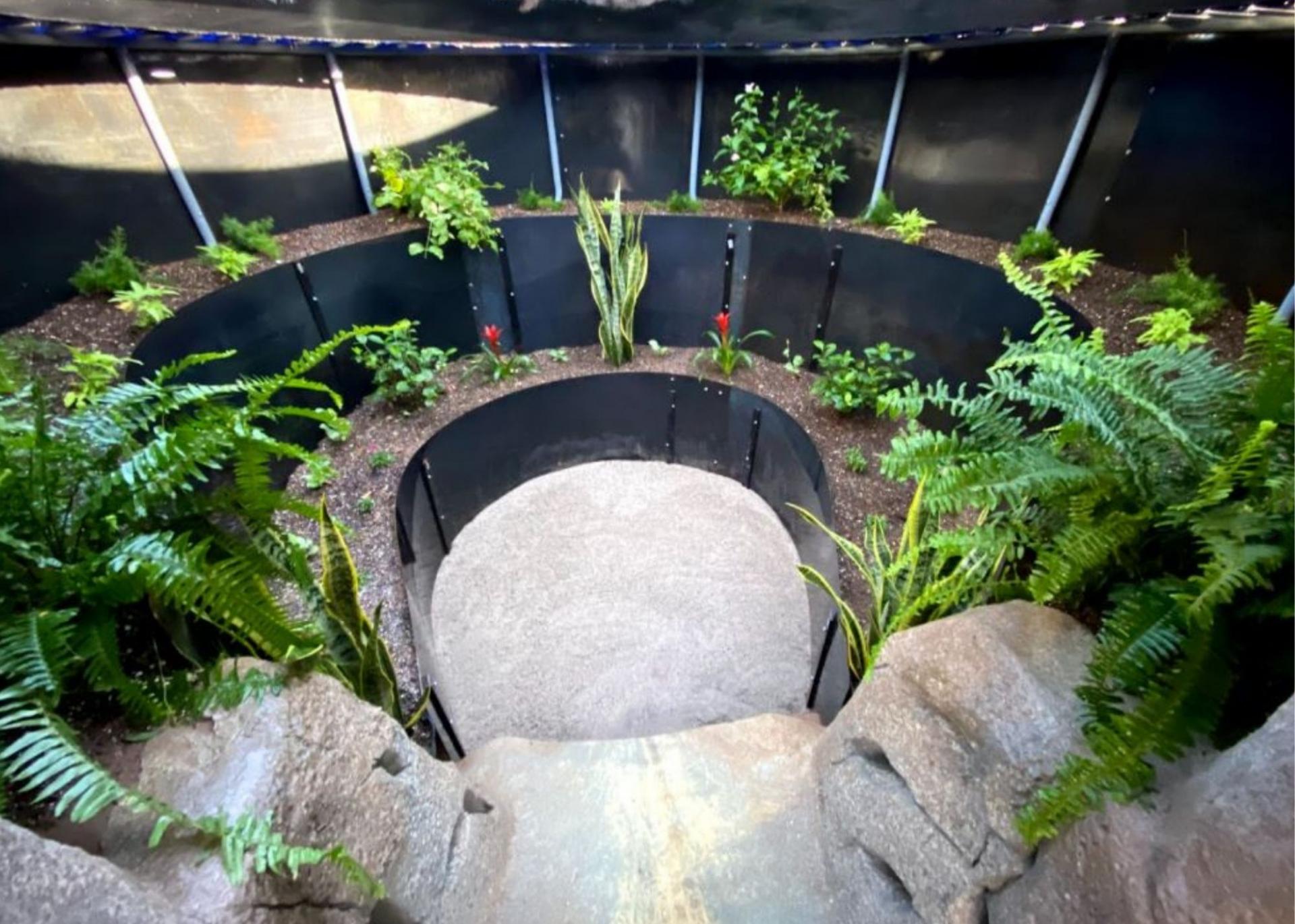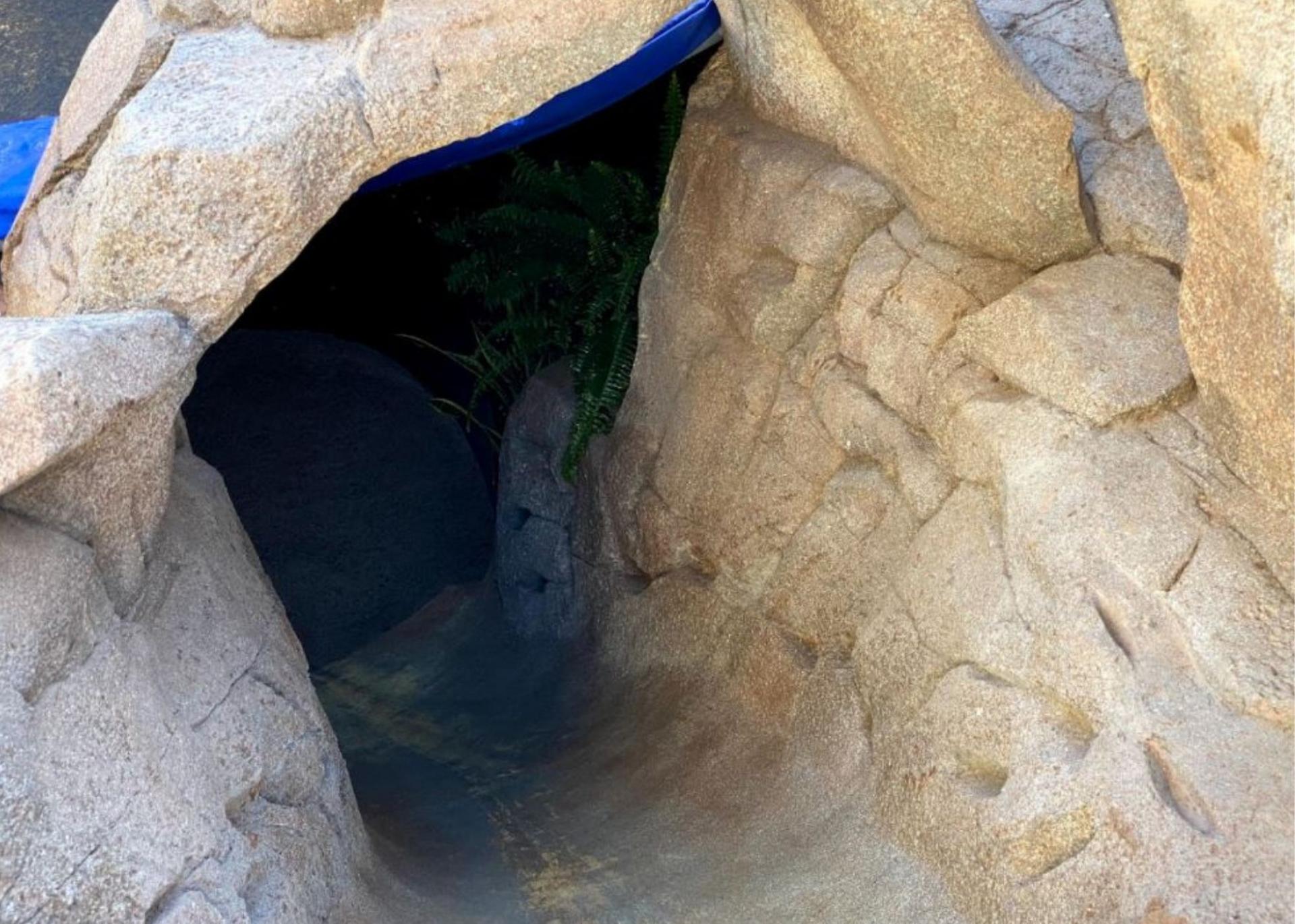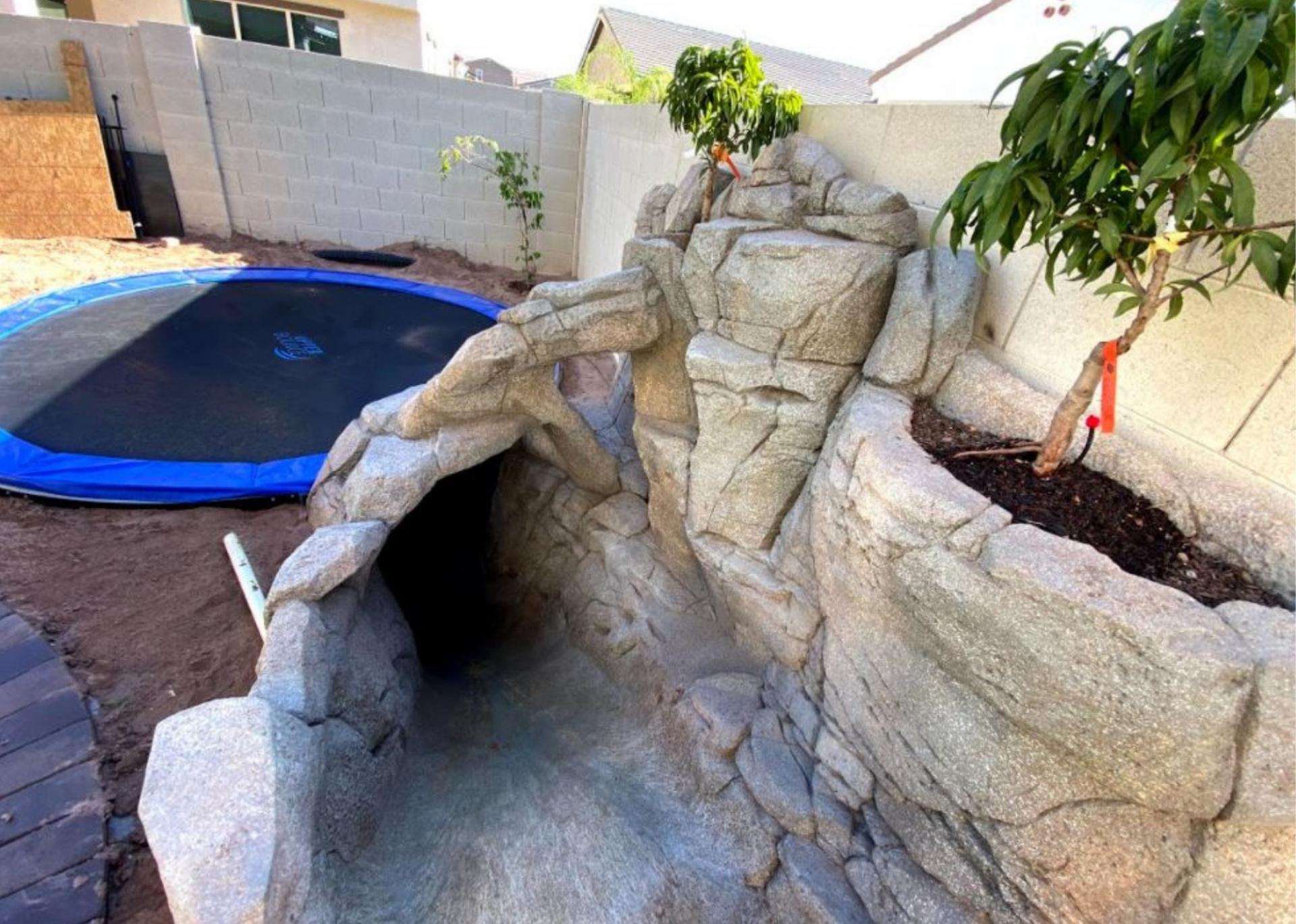 The view of the compleeted rock slide down to the underground trampoline garden
